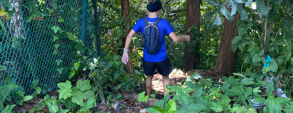 We walked through my old faculty, passing a few other blocks and onto an old deserted road that looked like it rarely had visitors. I have never been to this part of the school before. We walked along the long and empty road until we found the described entry point. We ventured further into the forest following a faint trail and circled around the area but found nothing. Intuition led me to go back to the start to try a different route, I followed the fence further in and just as I was staring intently around the forest, I finally noticed a concrete roof peeking out from right under my feet. I shouted for my friend to come. The outpost was indeed very well camouflaged, you wouldn't know it was there unless you came looking.