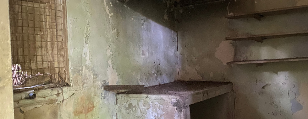 I looked around for a way down and found a flight of steps overgrown with veins. As I descended down the steps, the sprawling complex came into view. There were 2 main terraces built into the hills. I walked along the upper terrace consisting of a row of individual rooms with light blue doors. They were mostly empty, but I could make out the function of a few rooms including a lavatory with a squat toilet on an elevated concrete platform. We walked down another flight of stairs to the lower terrace. Plastered across a wall were the words '1936 BK 3' - the buildings were actually in very good condition considering that they were built in 1936. The lower terrace had a similar layout as the upper one, a few more distinguishable rooms included - one with a bathtub, one that looked like a kitchen with a hood and stove top as well as a similar lavatory at the far corner. I suppose these were the living quarters for soldiers in the past. There were a few other ruins scattered around the area, including a concrete tank with pipes sticking out, which was likely used as a water tank.