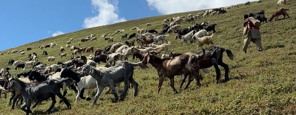 At the top of the hill, we took a short break to catch our breath before continuing. The trail was back to being relatively flat at this point. We then saw a huge herd of goats running down from the top of the mountains towards us in a stampede. A herder was herding them towards the bottom of the mountain. The past few days we mostly saw sheep and mules, and it was the first time seeing a huge herd of goats. They were a lot bigger than I thought, about twice the size of sheep.