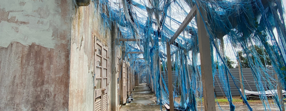 The last location was 2 abandoned buildings that stood side by side, a blue house and a white house on stilts. Though the wall paint has partially chipped off, the house still retained a beautiful shade of deep blue. Matching its bright exterior, the house also had a beautiful interior - through the entrance, we descended a few steps into a living room with patterned floor tiles. Next to the living room was the kitchen fitted with cabinets. The house had an interesting layout, unlike most modern houses we see. Complementing its blue walls were shredding blue tarp draped all over the building. We continued to walk around the house and a few of the rooms had old furniture strewn all over, bed frames, TVs, washing basin.